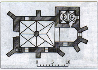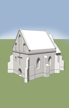 Першапачатковы выгляд святыні не захаваўся. Магчыма, гэта быў прамавугольны залавы бязвежавы храм з пяціграннай апсідай, арыентаванай на ўсход, з адной сакрыстыяй з паўночнага боку. Сцены касцёла былі ўмацаваныя контрфорсамі. Памеры тагачаснага будынка складалі 12,8 х 9,8 метраў. Вонкавыя сцены былі выкладзены ў тэхніцы гатычнай муроўкі з гладкай светла-чырвонай цэглы памерам 28–29х13–14х8–9 см на вапнава-пясчанай рошчыне. На бакавых гранях некаторых цаглінаў ёсць сеткавы арнамент. Падмуркі складзены з неапрацаваных вялікіх і сярэдніх валуноў. Трываласць падмурка ад старажытнага ўзроўню зямлі, г.з.н. да глыбіні 1,1 м ад падэшвы, роўная 1,6–2 м. У ніжняй частцы падмуркаў першыя два рады валуноў былі пакладзены насуха.