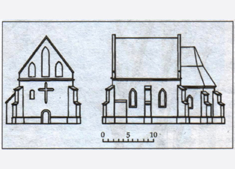 Першапачатковы выгляд святыні не захаваўся. Магчыма, гэта быў прамавугольны залавы бязвежавы храм з пяціграннай апсідай, арыентаванай на ўсход, з адной сакрыстыяй з паўночнага боку. Сцены касцёла былі ўмацаваныя контрфорсамі. Памеры тагачаснага будынка складалі 12,8 х 9,8 метраў. Вонкавыя сцены былі выкладзены ў тэхніцы гатычнай муроўкі з гладкай светла-чырвонай цэглы памерам 28–29х13–14х8–9 см на вапнава-пясчанай рошчыне. На бакавых гранях некаторых цаглінаў ёсць сеткавы арнамент. Падмуркі складзены з неапрацаваных вялікіх і сярэдніх валуноў. Трываласць падмурка ад старажытнага ўзроўню зямлі, г.з.н. да глыбіні 1,1 м ад падэшвы, роўная 1,6–2 м. У ніжняй частцы падмуркаў першыя два рады валуноў былі пакладзены насуха.