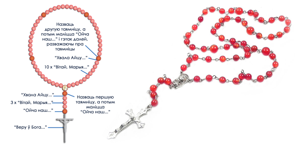 Напачатку мы бярэм у рукі крыж, робім на сябе знак Крыжа і чытаем “Апостальскі сімвал веры”. Затым бярэцца першая вялікая пацерка і чытаецца “Ойча наш…”. На трох наступных (малых пацерках) – 3 разы “Вітай, Марыя…” (просім аб памнажэнні веры, надзеі, любові), 1 раз “Хвала Айцу…”. Пасля гэтага называем частку Ружанца і першую таямніцу. На вялікай пецерке чытаецца “Ойча наш…”, на маленькіх – 10 разоў “Вітай, Марыя…”. Напрыканцы кожнай таямніцы вымаўляецца “Хвала Айцу…” і далучаюцца малітоўныя заклікі (з Фацімскіх аб’яўленняў):